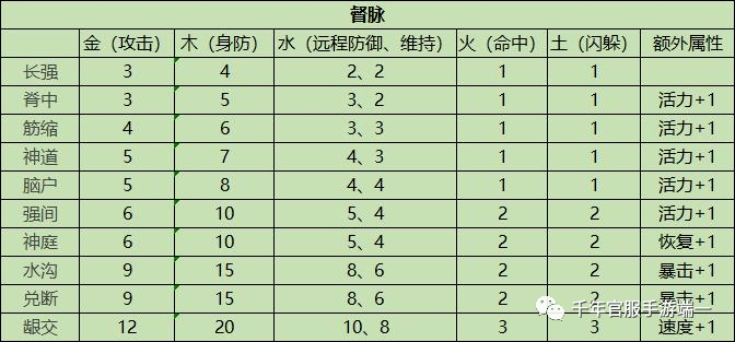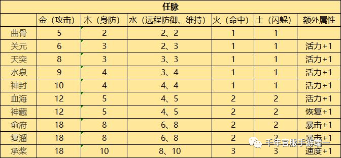 1、任脉:任脉为经脉系统的第一条脉,达到一定元气值能够开启任脉。任脉的穴位从前到后分别为:曲骨、关元、天突、水泉、神封、血海、神藏、俞府、复溜、承桨。