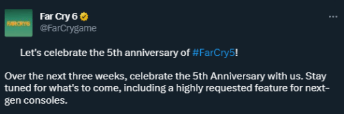 《孤岛惊魂》官方在推特宣布了这一消息,公告显示本次更新会为《孤岛惊魂5》提供次世代主机功能。此外,官方暂未透露具体细节。