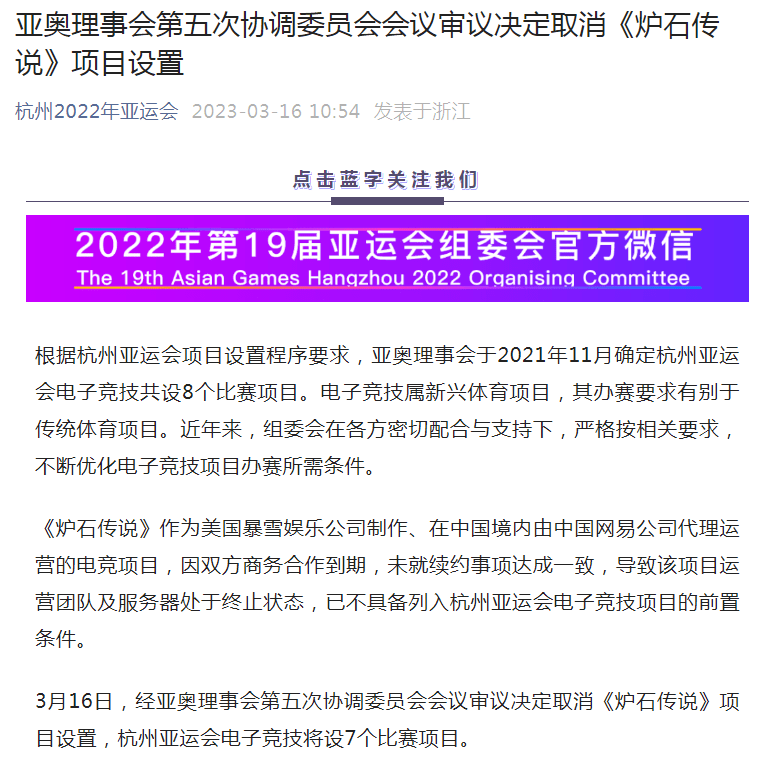 3月16日,经亚奥理事会第五次协调委员会会议审议决定取消《炉石传说》项目设置,杭州亚运会电子竞技将设7个比赛项目。