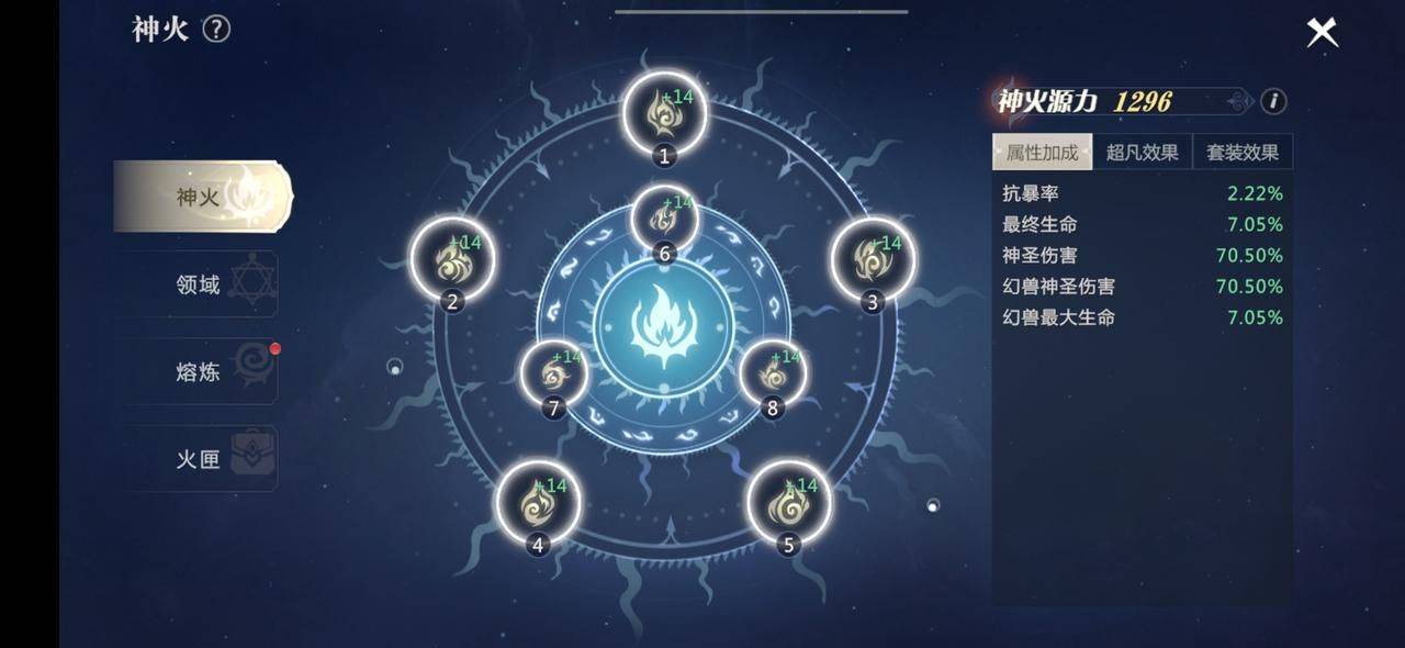 到了一定级别之后将开放神火系统,神火升级可获得神圣伤害,神圣伤害可大幅增加神怪伤害,并且进入神火领域获得超凡效果,套装效果和追加均能增加神火源力。神火又可被分解,被分解的神火将消失分解,被分解物取决于神火非凡的功效与养成,神火亦可被继承。神火追加需突破才能获得新的属性。