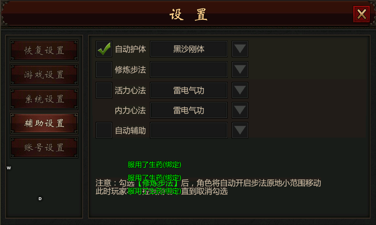 辅助类武学:设置栏打开,设置自动修炼即可。
