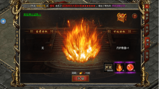 当我们解锁了丹炉玩法之后,咱们只要把神火升级到紫薇天火,第一件焚天装备就解锁了,咱们使用后,焚天套和雷神套很相似,不过不太需要充值获得,咱们只要升级神火就可以获得自选箱子,要升到紫薇天火需要的材料是梧桐叶,梧桐叶可以在每天的荣誉商店进行购买(荣誉值需要充值转盘转),还有神火宝箱(需要充值)也有一定几率开到。