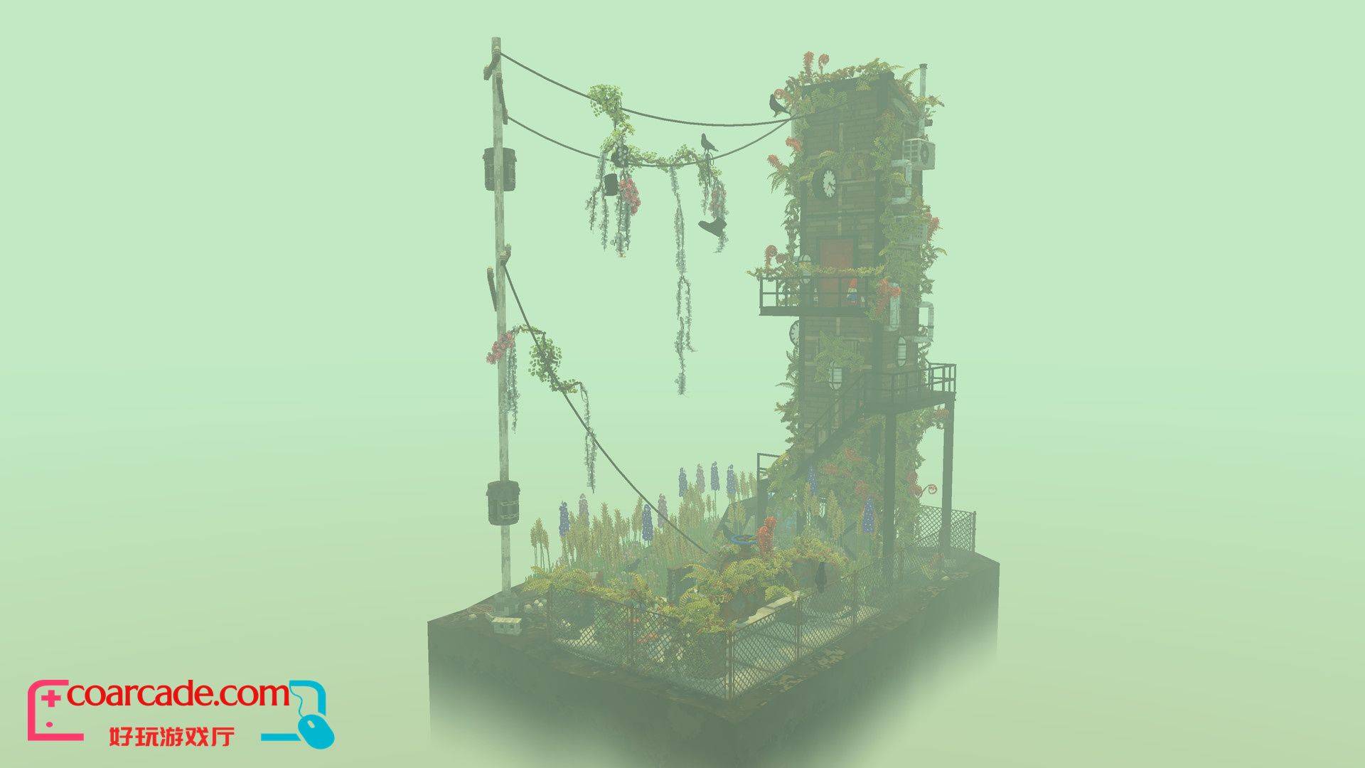 在一片破败废土背景下展现的另一番充满生机的场景,搭配舒缓温暖的音乐。在油画色彩风格的废弃停车场、破旧楼房屋顶等场景中播撒种子,让他们肆意的在人类灭绝后留下的痕迹之上蔓延成长,最终创造出一个自己理想中的另类空中花园。