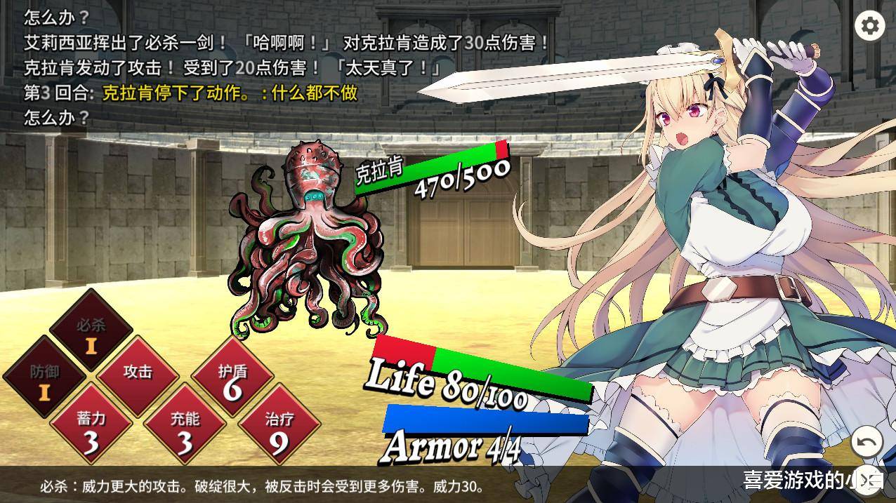 游戏的玩法非常传统,就是标准的回合制战斗模式,战斗过程采用文字描述形式展现。不过比较独特的是,战斗的过程是敌我双方同时出招,也就是类似石头剪子布的预判,敌人攻击的时候你防御,敌人蓄力的时候你攻击,由于除了普通攻击其他行动都有冷却时间,所以需要多次战斗掌握敌人的行动规律才可获胜。