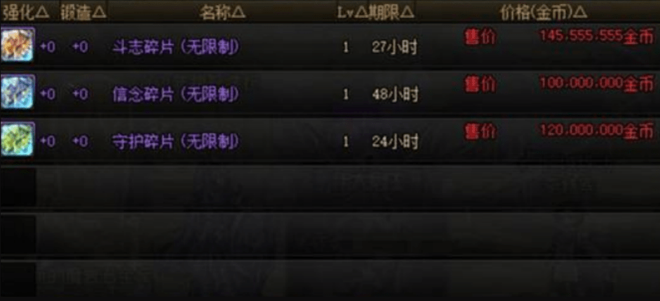 不过最让玩家们意外的是,虽然这三个碎片还可以在拍卖行买到,但这个碎片的价格却是让人服气啊。即使是最便宜的信念碎片也是卖到了一个一亿金币,而斗志碎片更是需要1.4亿金币才行。也就是说要想买齐这三个碎片称号,那至少得花费三亿金币才行。