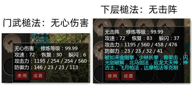 千年的武功属性加成很复杂,攻速、恢复、躲闪、攻击、防御,攻击和防御还可分为身攻、头攻、腿攻、手攻四方面,因此依据情况选择适合自己的武功是很有必要的。