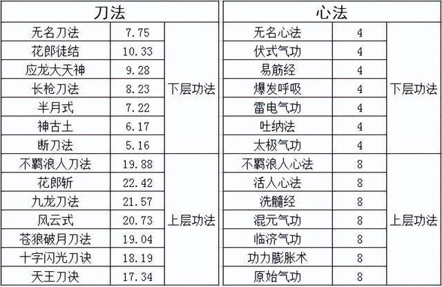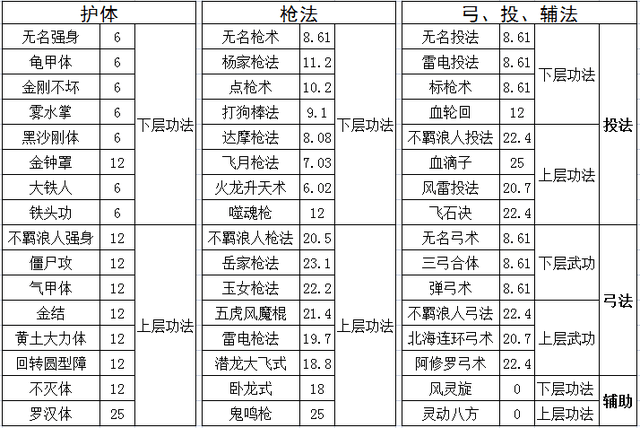 如图所示展示的是各种武功名称和对应的元气加成,元气加成乘以100其实就是武功的身攻加成,所以从图片就能看出上层武功和下层武功之间的差别。