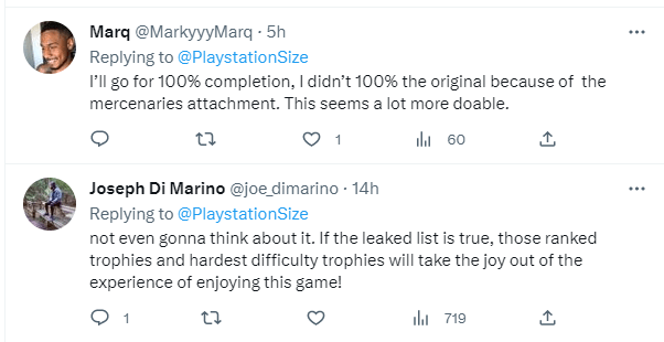 对此有网友在回复中表示会去追求100%完成度,也有玩家认为如果这个消息属实的话那么为了追求奖杯将会失去玩游戏的乐趣。
