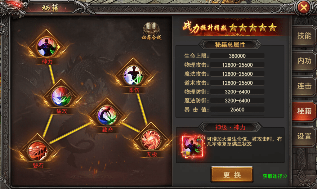 3. 就拿神力秘籍的附加技能来说,可增加大量的生命值,被攻击时,有几率回复至吗满血的状态,其他的秘籍附加技能玩家们可以在游戏里去了解一下,就不一一介绍了。