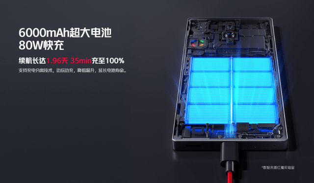 红魔8 Pro内置6000mAh的电池,搭配80W有线快充;红魔8 Pro+内置5000mAh的电池,搭配165W有线快充。