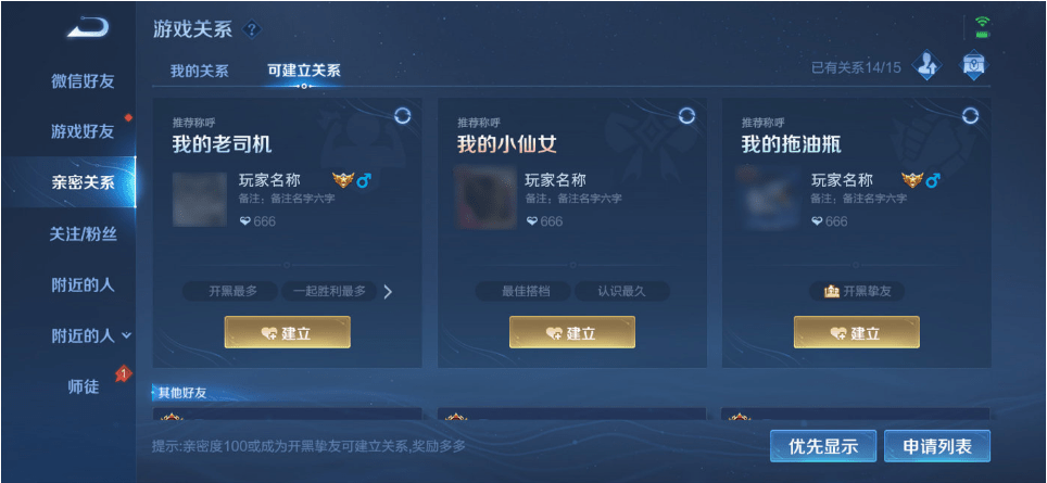 新增临时好友机制,当玩家与朋友的朋友组队开黑后,如果有互赞等良性互动,双方将在彼此的组队列表展示一段时间,在此期间可以进行组队开黑邀请等行为。长时间无组队开黑行为或未添加游戏好友,双方会在彼此的好友列表中消失。