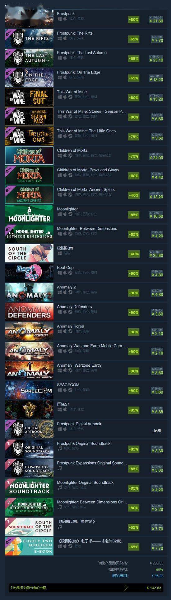 捆绑合集中包括有《冰汽时代》、《莫塔守山人》、《这是我的战争》、《极圈以南》等作品及相关DLC、音轨。活动将于北京时间3月24日凌晨两点结束。