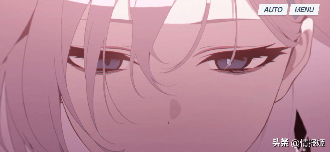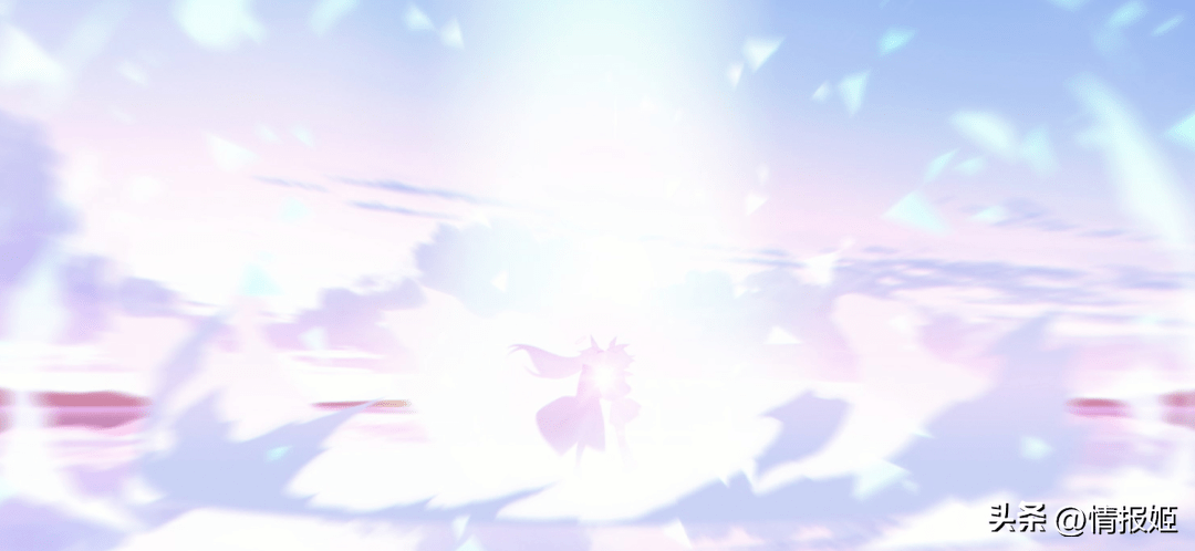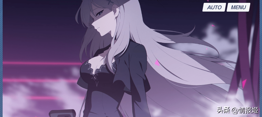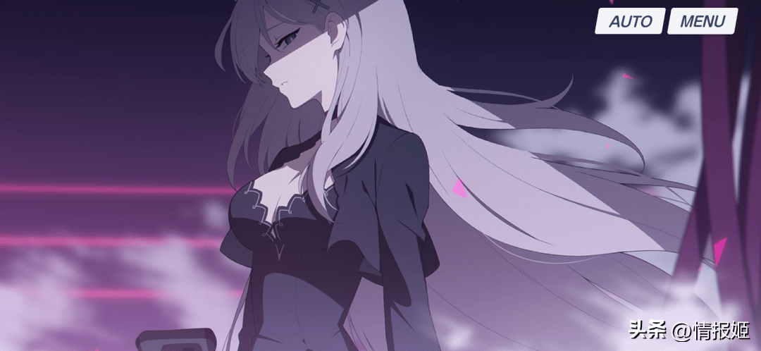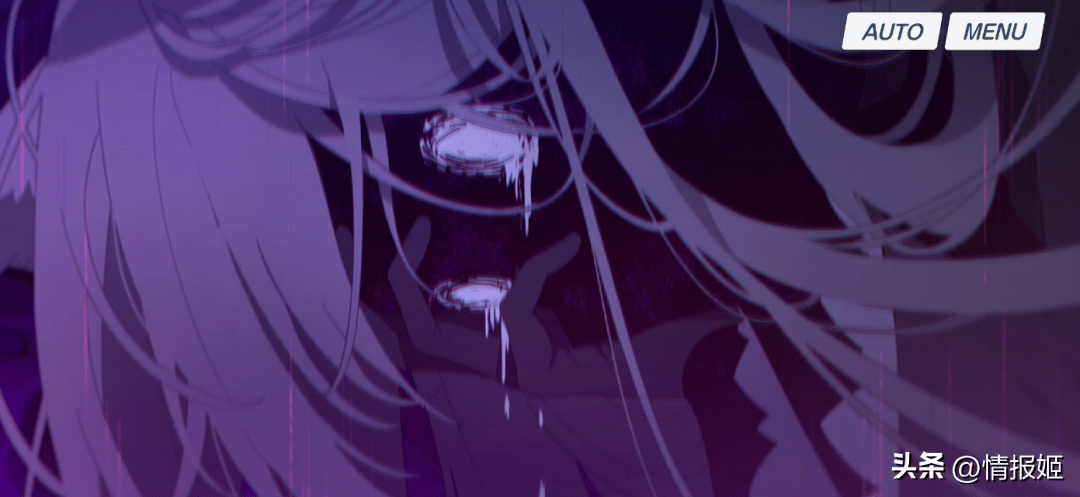 图片中,角色摆出这幅表情和姿势都只是“一瞬之间”的情况,下一瞬间就不是这个姿态了。画面周围的紫色碎片粒子能够展现出当前画面是极端动态情况下的一刹那。在这种情况下,CG与其说是CG,不如说是漫画的一格一格分镜。