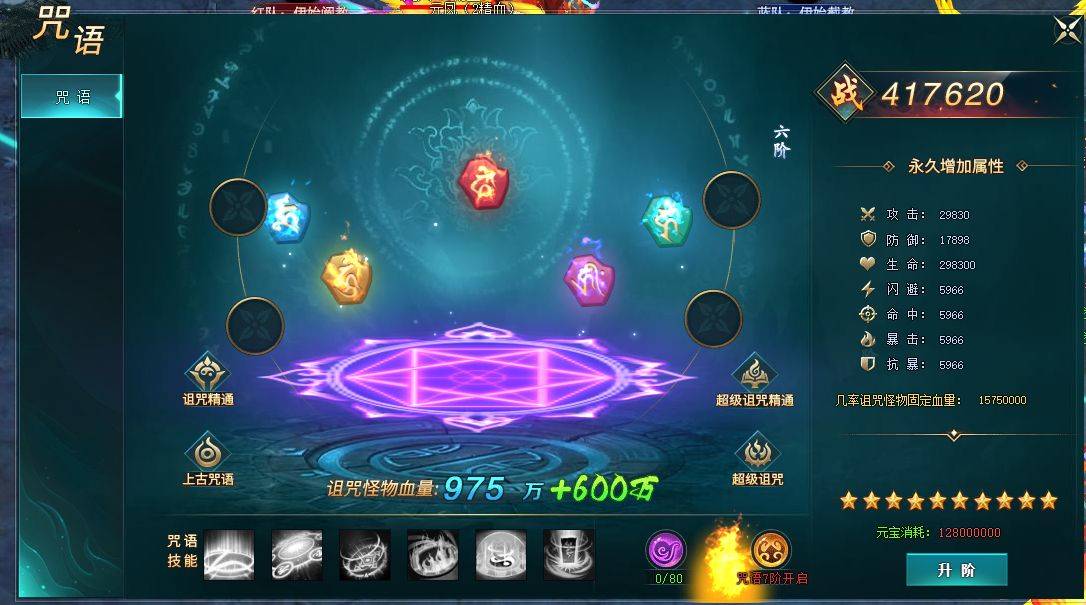 今天要给小伙伴们带来的是《上古传说》的咒语系统,咱们的咒语系统不仅能给咱们角色带来大量的基础属性,它还有几率诅咒怪物固定血量。并且还有6个专属技能,咒语攻击:增加攻击250。咒语防御:增加防御500.咒语生命:增加生命4000。咒语高级攻击:增加攻击500.咒语高级防御:增加防御1000。咒语大师:所有技能的属性提高100%。除此之外还有4件装备,分别是咒文、咒神、咒魄、咒魂,它们都能给主角提高生命、攻击、防御。