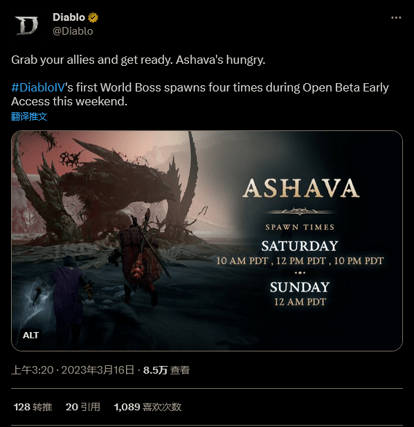 在《暗黑破坏时》抢先 Beta 测试正式推出之前,暴雪公布了首个世界 Boss Ashava 的重生时间。Ashava 将在太平洋时间周六出现 3 次,周日出现 1 次。《暗黑破坏神4》的抢先 Beta 测试将于 3 月 18 日凌晨 12 点开始,截至 3 月 20 日凌晨 3 点。