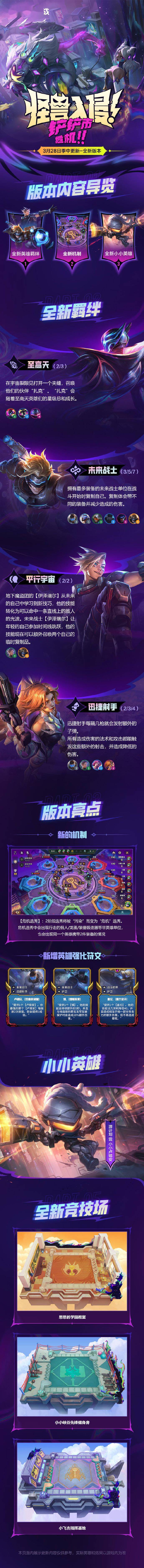 - 全新机制:危机选秀上线,2 阶段选秀将被“污染”,会出现行走的假人 / 龙蛋 / 装备锻造器等,也会出现一个英雄携带 2 件装备的情况(3-6 阶段还有可能再次出现);新增强化英雄符文。
