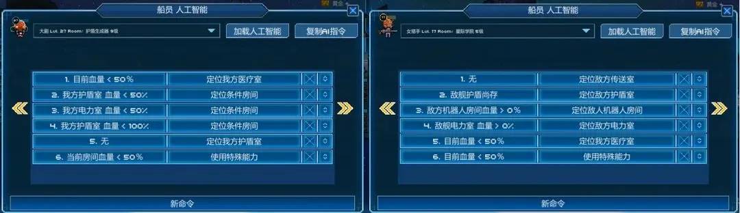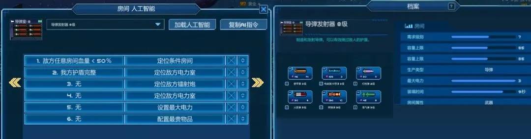 1、你需要知晓各房间的用途、属性、弹药、电力需求、加载速度等,充分评估他们的重要性,对各房间进行合理布局与设定AI指令,以达到重要房间的保护与隔离、战时各房间的电力配给、船员对房间的最快到达速度修复、武器房间的最优攻击指令、弹药的合理选择、阻碍敌方船员登舰的破坏速度、各武器的加载速度及伤害等等。