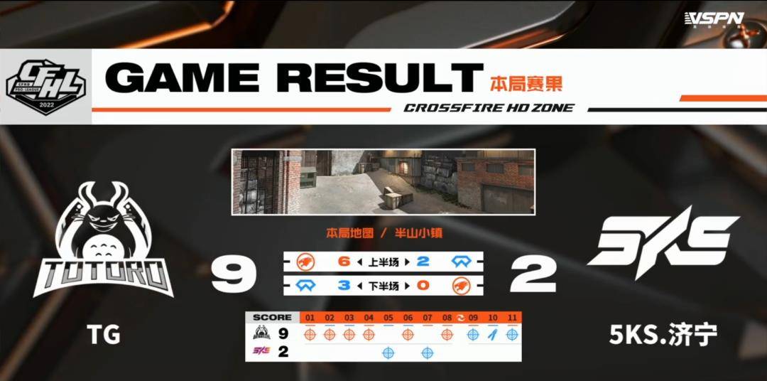 次局半山小镇,比赛的形势丝毫没有改观。率先担任潜伏者的TG由BluE1配合Xbai在B包完成刷屏,TG利用枪法优势进行快攻连续拿分,将比分拉开。D1pxZ在A包点完成单局三杀,5KS拿回挽回颜面的一分,不过TG依旧牢牢控制着比赛的主动,稳健防守A包拿到最后一分,也以9-2的比分赢下第二局,总比分2-0战胜5KS。