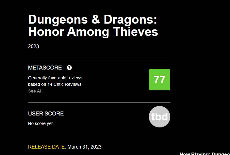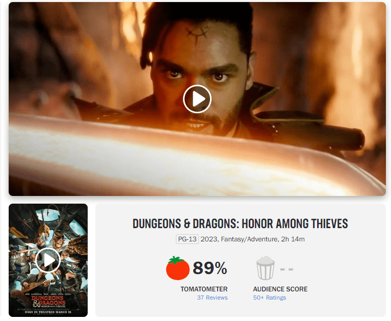《龙与地下城:侠盗荣耀》此前已于西南偏南电影节举行首映,影片全方位的亮眼表现激起了各大权威媒体的盛赞浪潮,建立起了绝佳口碑。目前烂番茄新鲜度89%,MTC评分77。