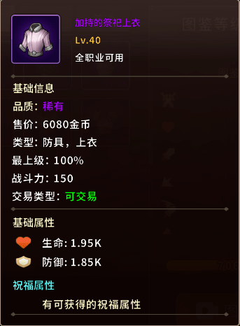 胸甲装备推荐也是加持的祭祀胸铠,毕竟是一个套装,所有名字是差不多的,他增加的战斗力是150要比肩甲增加的战斗力多一些,基础属性是增加一千多的生命值和一千多的防御力,这件装备也是没有其他效果的,也不能镶嵌晶石。
