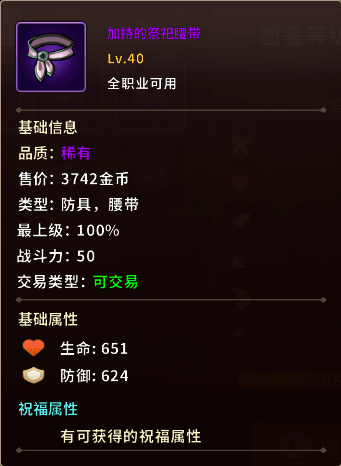 腰带装备是加持的祭祀腰带,这套装备的名字就是叫祭祀锋套装,他增加的战斗力就很低了只有50,基础属性增加也是非常低的生命值和防御力都是增加六百多,也是没有效果的,不能镶嵌晶石。