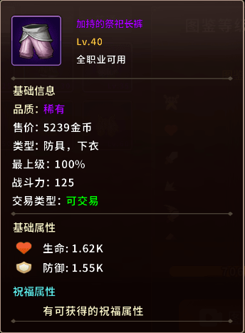 下装装备是加持的祭祀护腿 ,这个就是下装了,增加的战斗力是125,基础属性是增加一千多的生命值和一千多的防御力,稀有品质的装扮都是没有效果加成的,但是有套装加成,而且也不能镶嵌晶石。