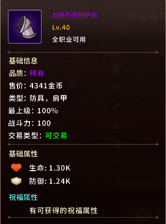 第一件装备是我们的肩甲,名字叫加持的祭祀护肩,品质是稀有的一个装备。稀有装备是游戏中最容易获得的。他的属性会增加100的战斗力,基础属性是增加一千多的生命值和一千多的防御力,稀有的装备是没办法镶嵌晶石的,只有史诗和神器品质的装备才可以镶嵌晶石。
