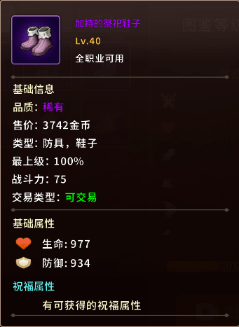 这套装备的最后一件加持的祭祀靴子,增加的战斗力也只有75,只有重要位置的装备增加的属性要高一些,基础属性是增加九百多的生命值和九百多的防御力,也是不能镶嵌晶石和效果的,但是这些装备都可以获得祝福属性加成。
