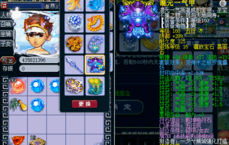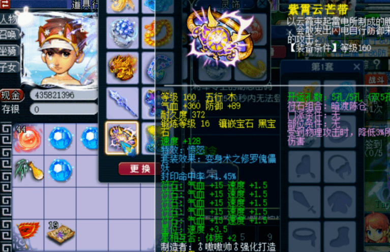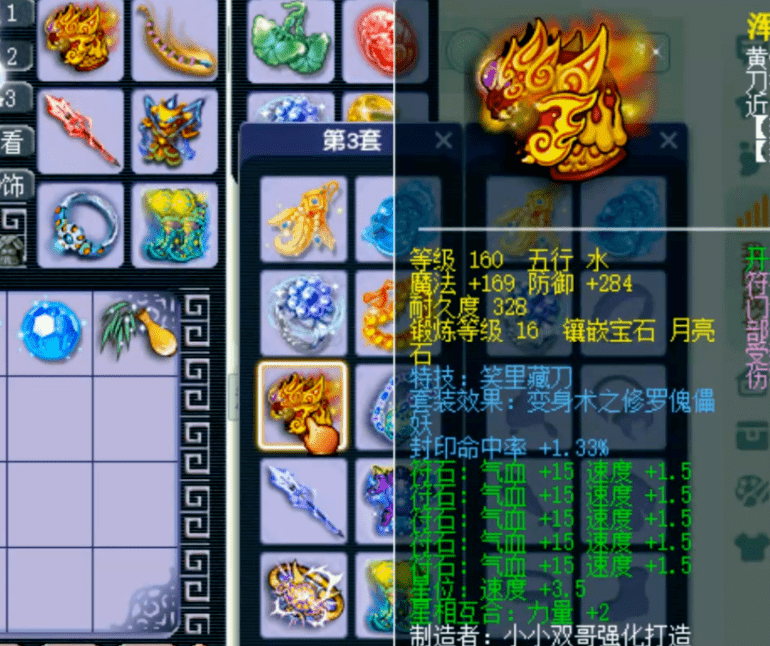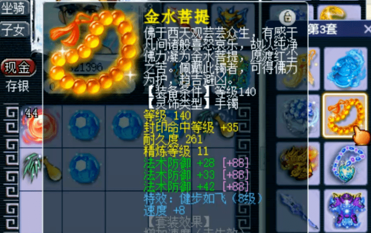 右排灵饰配置的是11锻140手镯与佩饰,组成6法防属性。现在武神坛法系谛听太多了,右排灵饰堆法防是明智之举。总体来看,这位服战五庄的装备几乎都没什么提升空间了吧?