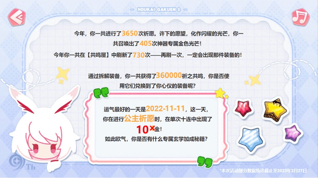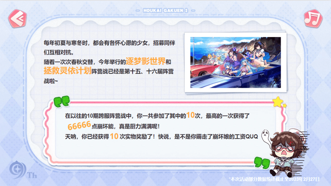 在周年回忆录中,小伙伴们可以查看这一年里在学园里留下的足迹,回忆与崩崩的点点滴滴~