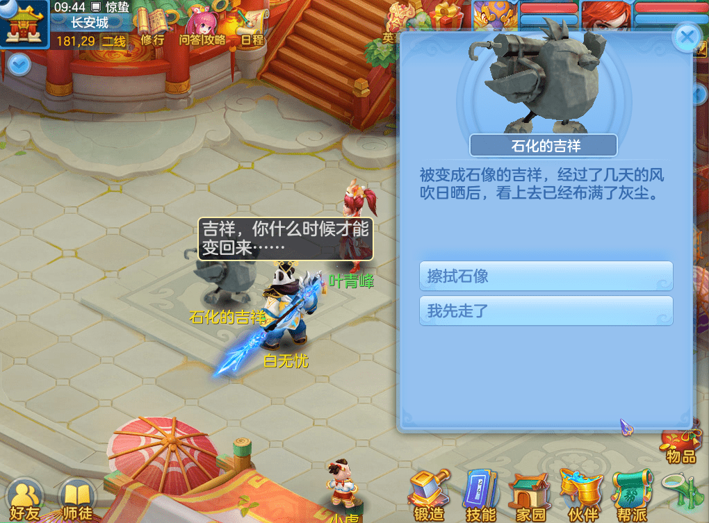 4)活动期间,长安城中将出现石化的吉祥,使用【无根灵露】擦拭石像时,可获得从吉祥背包中掉落的各种宝贝。