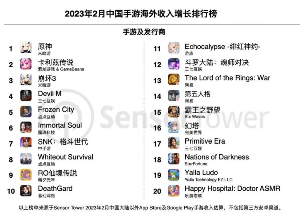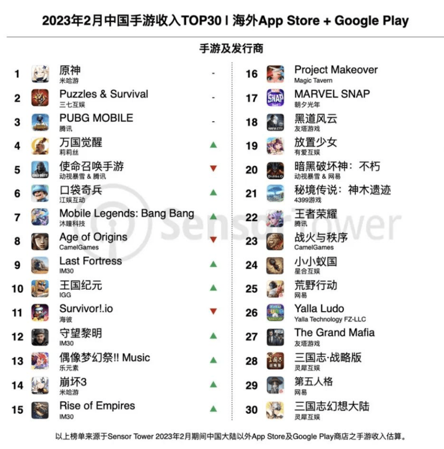 近日,Sensor Tower商店情报平台公布2月中国出海手游收入榜和收入增长榜,三七互娱多款游戏上榜,其全球化、多元化的转型之路再次获得市场认可。