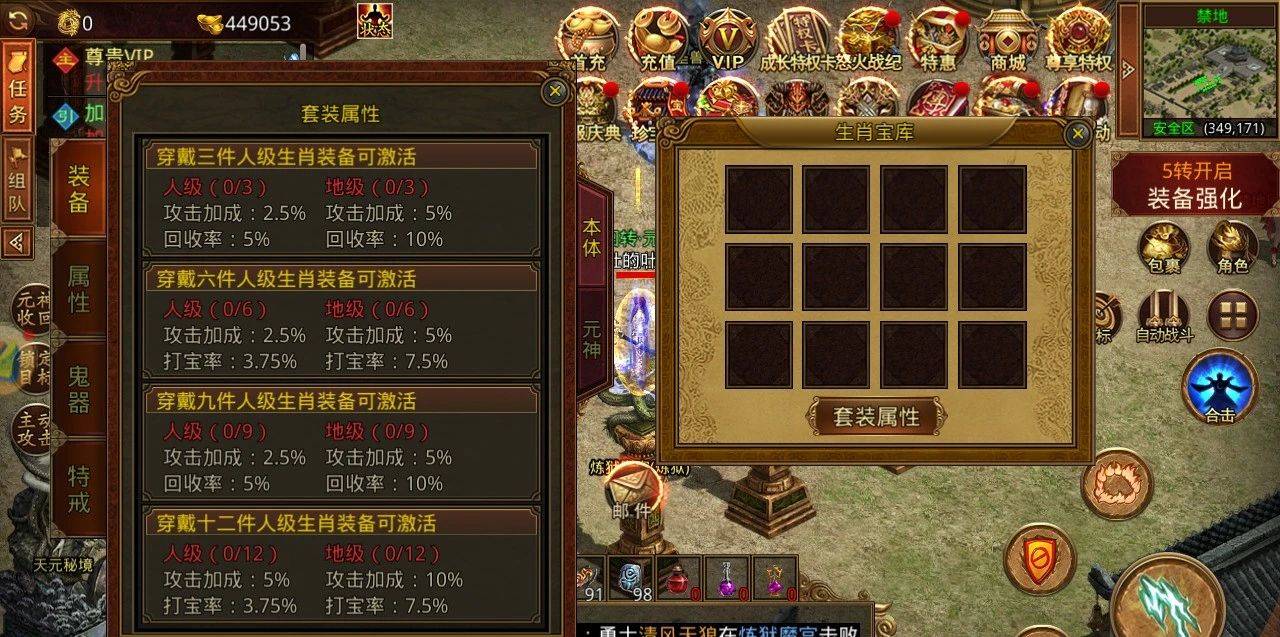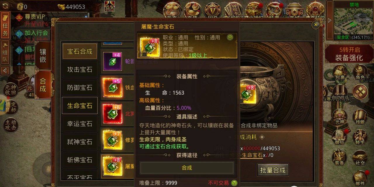 进入游戏元神觉醒直接选择组合即可 传世这款的顶级装备全是靠野外掉落或装备进阶而成 开始先推荐大家优先前往八仙纵横挂机这个地图怪物难道不高 却又可以爆出高级装备后续也可以使用装备的融合进阶