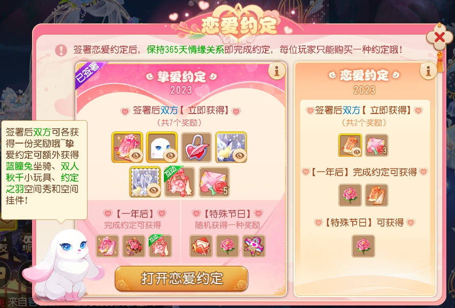 从即日起至2月17日,情缘玩家双方将可选择签署恋爱约定或者挚爱约定,直接解锁丰厚的签署奖励!此外,在特殊节日到来时,你们还将收获诸多祝福和礼物哦!而约满一年后,双方更将解锁约定完成奖励,为你纪念一整年的甜蜜!