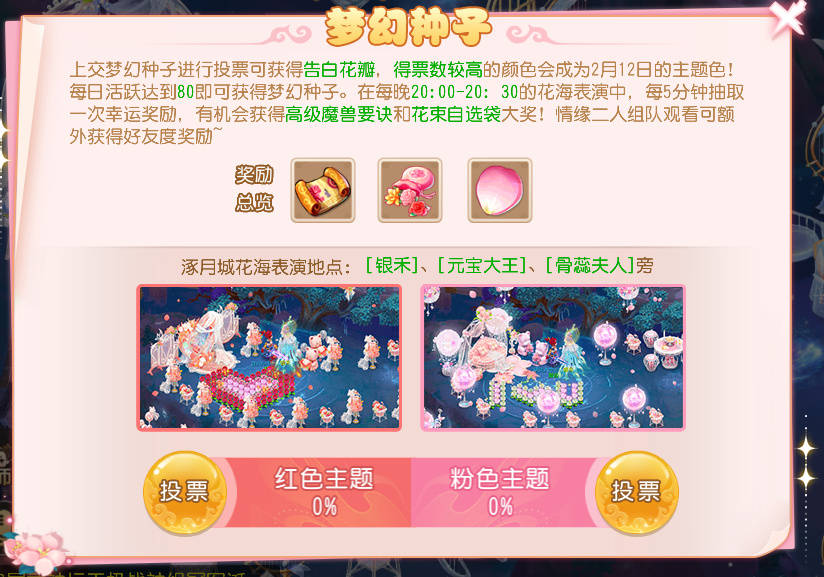 为营造浪漫氛围,在情人节活动期间,涿月城和长安城也将为三界有情人点亮梦幻主题色!从即日起,各位玩家可通过积累活跃度获取梦幻种子,并前往涿月城参与第二天的“梦幻主题色”投票。积极参与投票的玩家将可获得告白花瓣奖励。