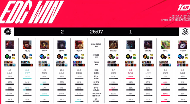 在LPL春季赛的最新一轮比赛中,EDG以2比1的比分战胜了OMG,继续保持着联赛榜首的位置。尽管OMG在前期展现出了惊人的进攻能力,但是在中后期EDG稳健的发挥下,最终掌控了整个局面。这场比赛不仅展现了EDG队伍的整体实力,也为OMG未来的发展提供了很好的机会和经验教训。作为精英选手的他们,在比赛中总结经验,不断完善自己的策略,相信会在接下来的比赛中展现更强的实力。