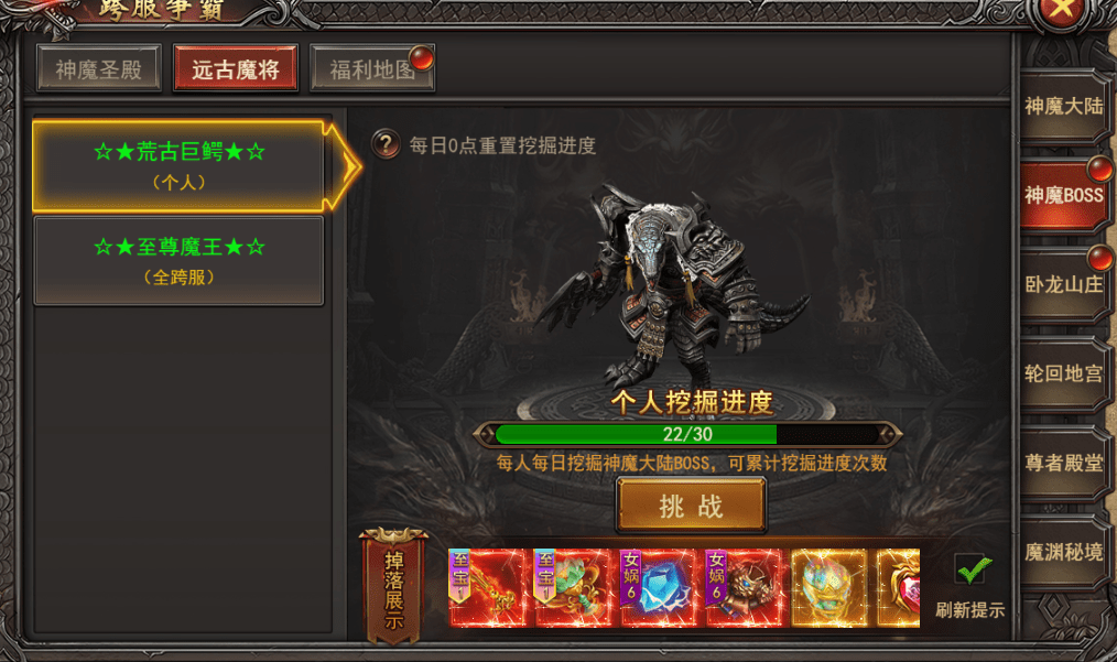 1. 远古魔将在跨服系统神魔BOSS,荒古巨鳄是个人BOSS需要玩家每人每日挖掘神魔大陆BOSS 30次以上可以进行挑战。