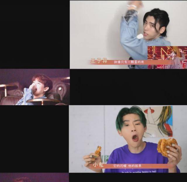 随后登场的王子异,手上拿着一根黏糊糊的卷发棒,扮作麦克。“唱”完之后,他结束了尤长靖唱歌时的惯用动作。王子异平时不走搞笑路线,却不知不觉搞笑了。这明显是精心设计的“出场”,让尤长靖忍不住笑了起来。王琳凯小魔王出场时,手里还拿着一个汉堡包,边吃边“唱”。夸张的动作,分明就是来搞笑的。不知道拿着东西吃的设计有没有和陈立农商量过。