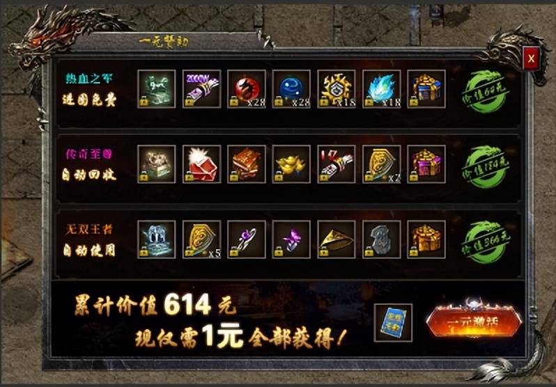 但是建议打金玩家一定开通这个“一代枭雄”赞助50米,不仅拥有更加霸气的称号还能解锁范围拾取以及掉落非绑,然后就可以开启我们的打宝之旅,配合自动回收,玩起来也是非常舒服。打金的效率也能质的飞跃!