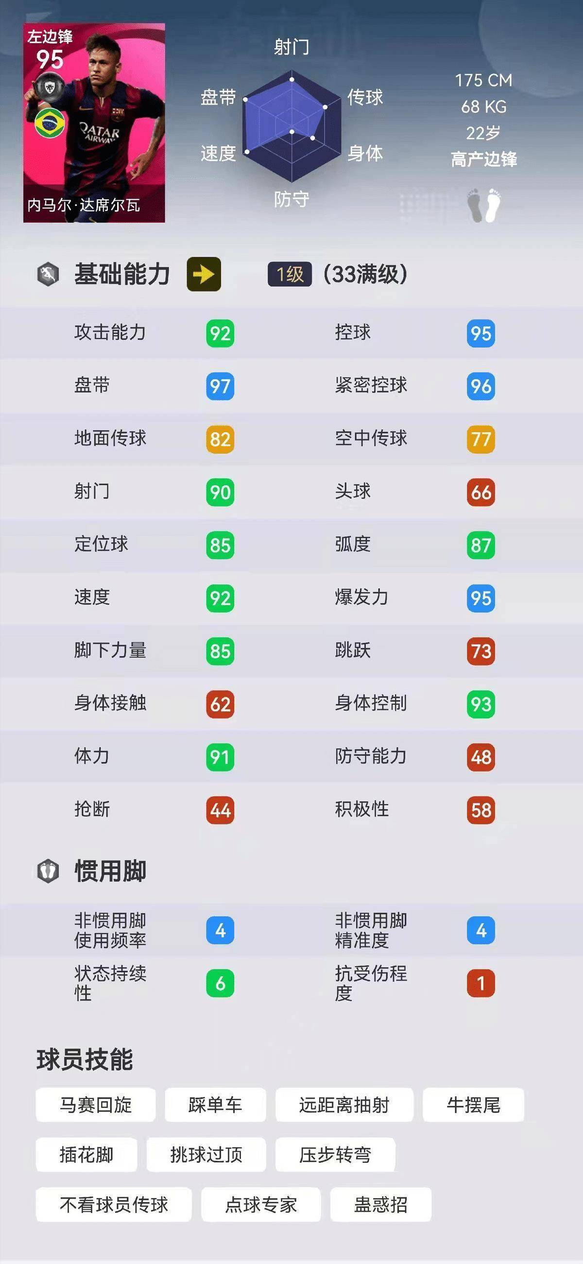 本次版本内马尔的数值设定,97盘带,95控球和96紧控球,可以说内马尔的巅峰实力得到了很好的恢复,因为他靠着炫目的盘带和控球被球迷所熟知;此外,90的射门、92的速度和95的爆发力也在很大程度上说明了内马尔是一名真正的边路射手。