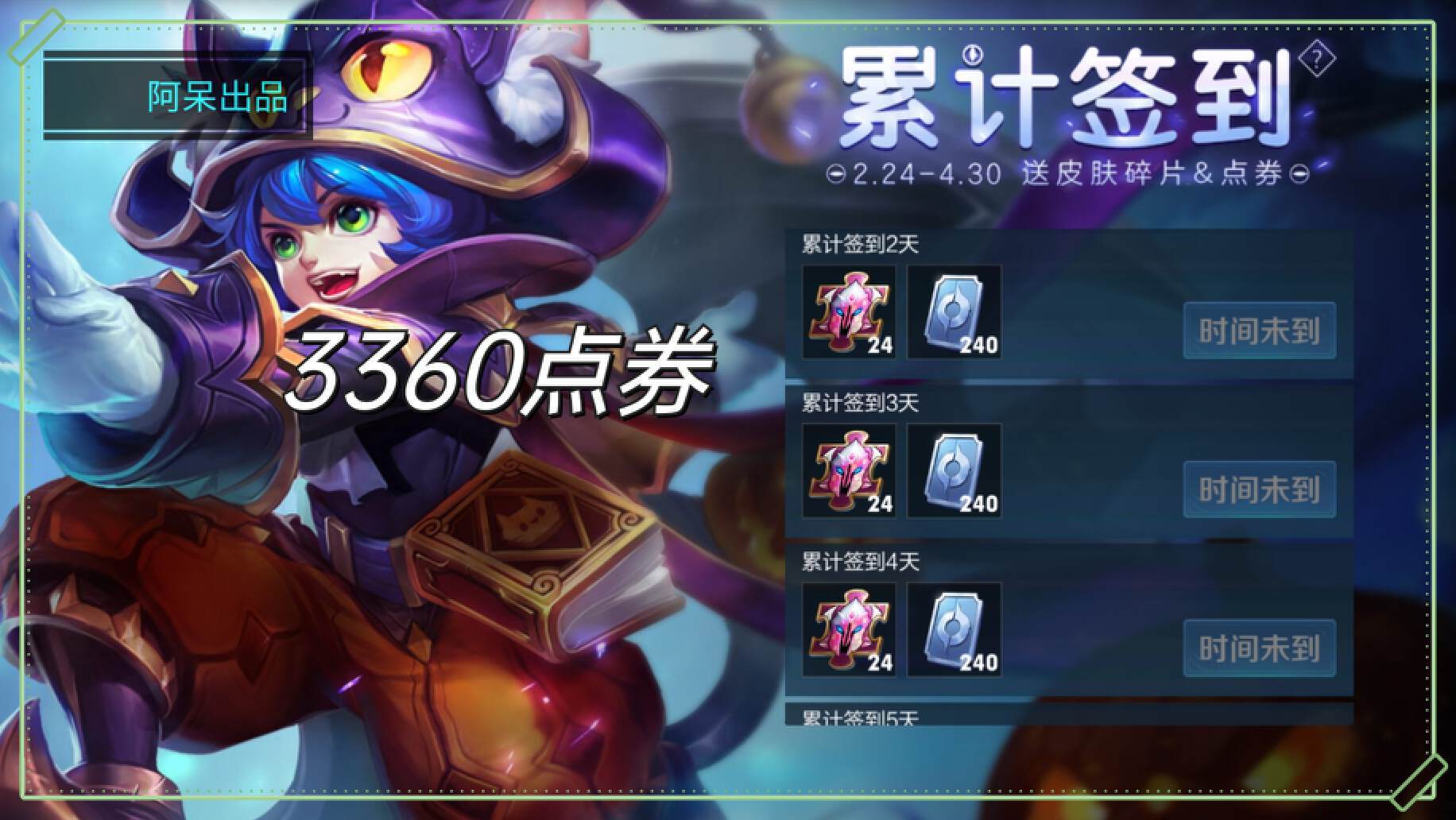 也就是累计签到活动,每天签到可以领取240点券,同时还有24个皮肤碎片,这个活动在2月份的时候就已经开启了,一共可以签到7天,每天领取的奖励都是一样的,如果7天都领完的话,那么一共有1680点券以及168个皮肤碎片。