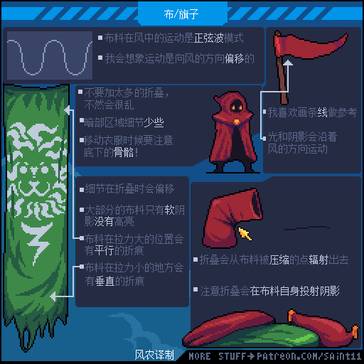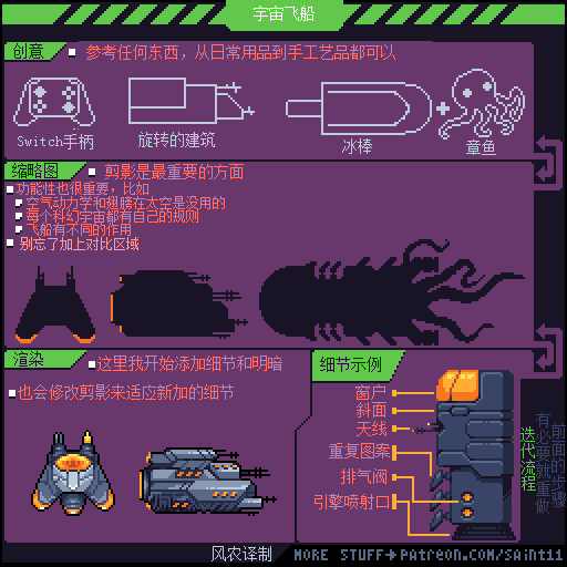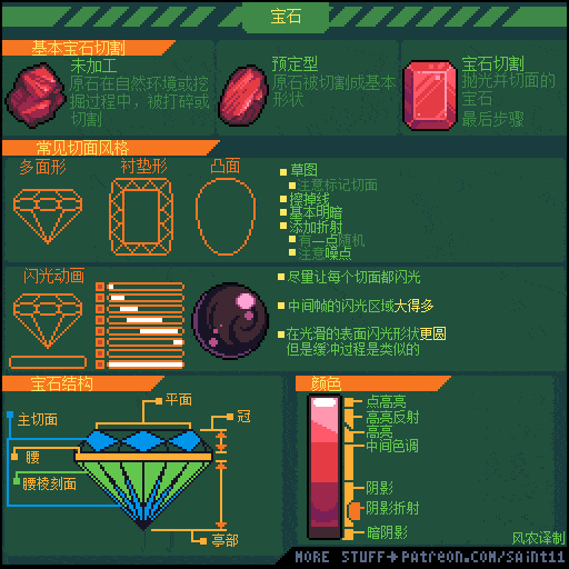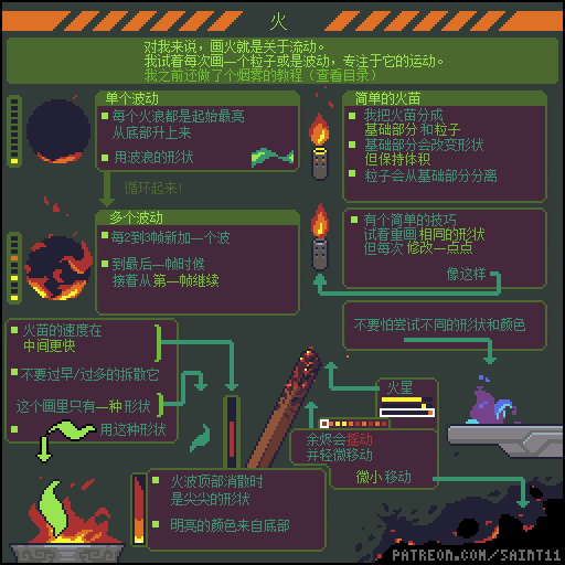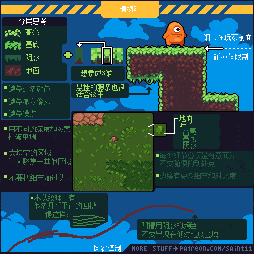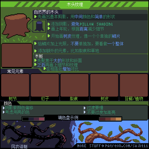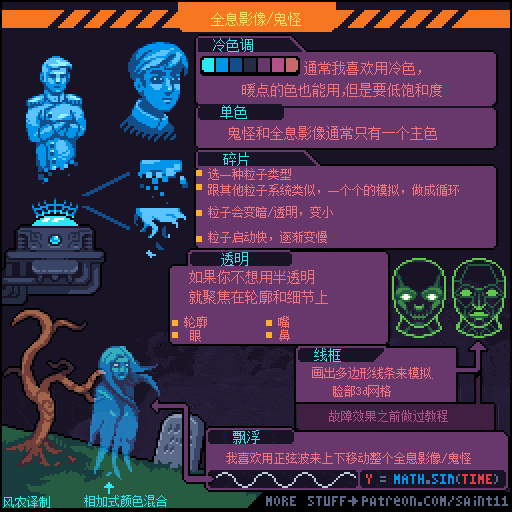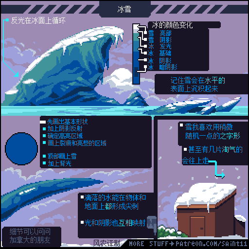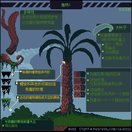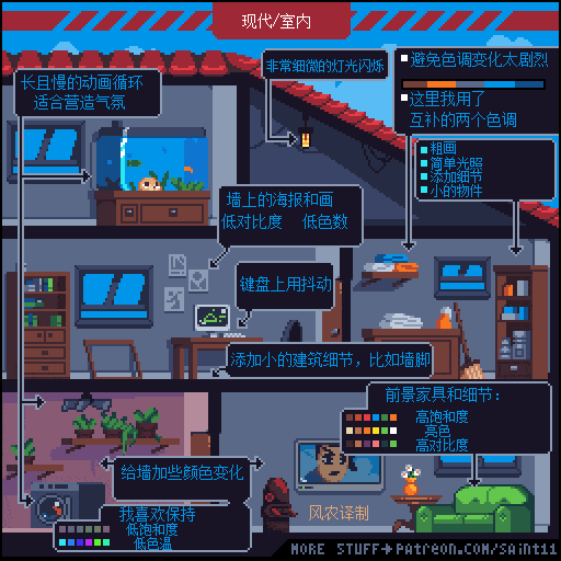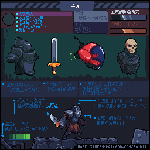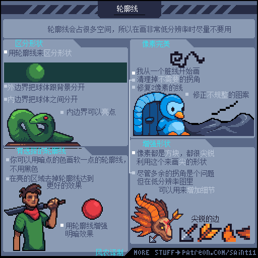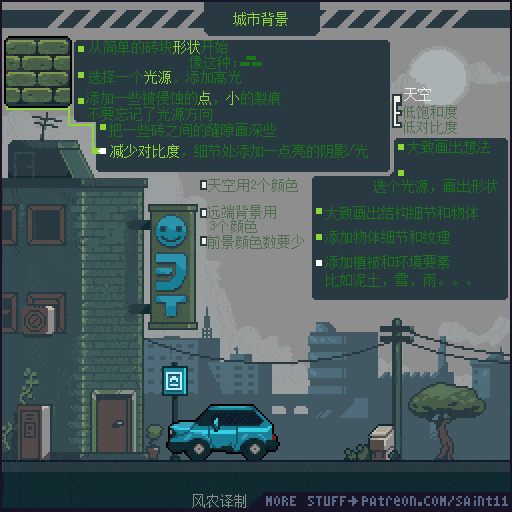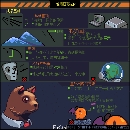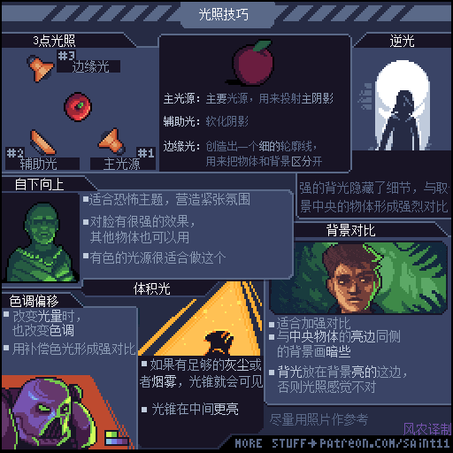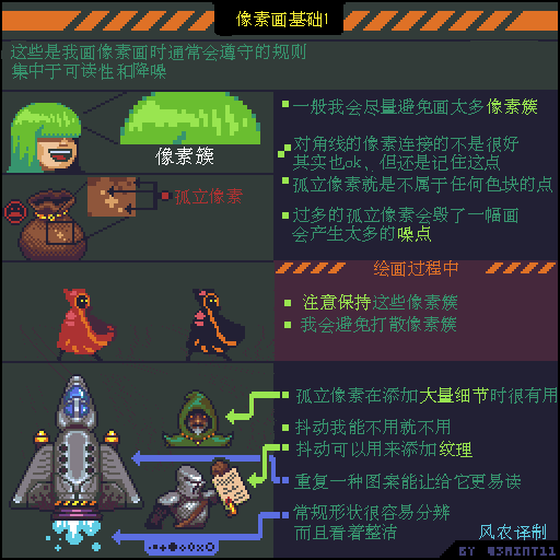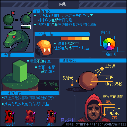 游戏设计师 Pedro Medeiros,他曾经制作过一款游戏《Celeste (蔚蓝)》,在制作这款游戏的几年时间里面,他把自己在学习像素艺术过程中解决的问题,制作成了像素绘制的经验技巧的教程, 每周更新一篇,持续了好几年!而且是免费分享的分享!