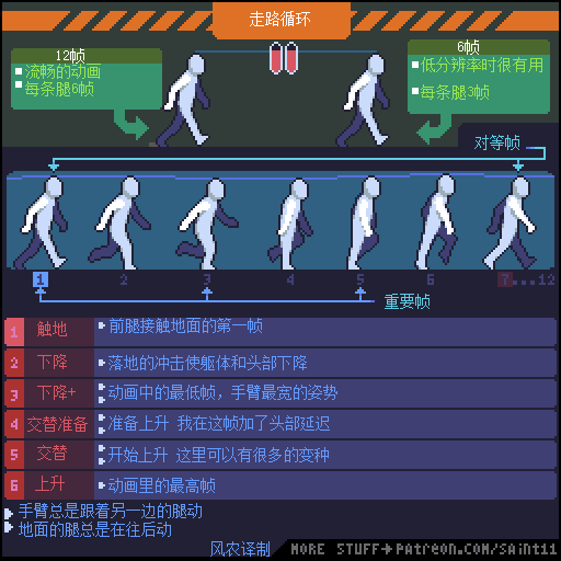 这是我能想到最简单的走路循环了。我画成了12帧长,所以可以很容易的剪成6帧的。除了这个之外,其他的走路循环我都画成8帧+2 (10帧)的,为了流畅性。