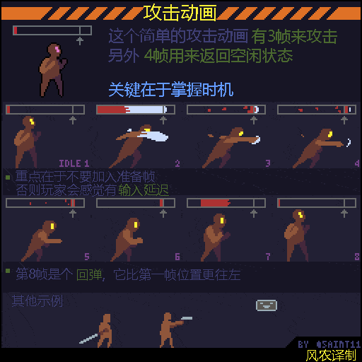 做攻击动画最重要的一点就是让玩家输入后瞬间得到反馈。所以第一帧就要立即覆盖攻击判定区域,不要加预判动作,啥都别加。