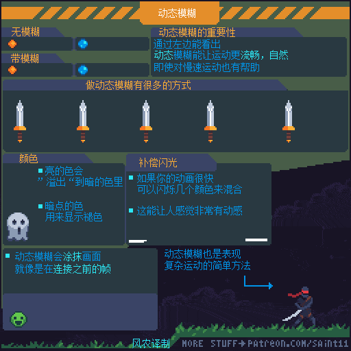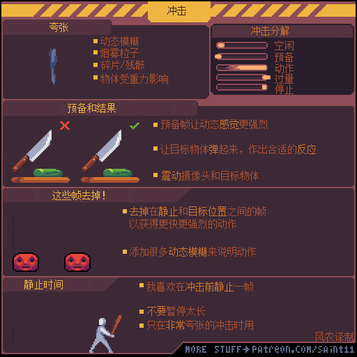 好问题,如果剑在身前,直接把它往下移动看起来没什么力。有时候,剑,拳头,或者别的什么东西不在你想要的位置,你可能觉得要加个准备帧。这没错, 但是这可以做个假。我通常会用个”风斩“,或者其他的模糊效果来模拟它。假装攻击是从你想要的位置发起的,而且极大的夸张了整个动作。玩家不会察觉到缺少了准备帧。另外一个技巧就是用长点的返回动画。