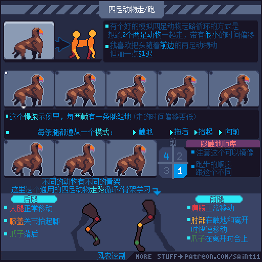 如果你要学着画一个四足动物的行走循环,你需要先画一个两足的行走循环,再复制一份,然后把时间偏移25%左右,取决于你想要达到的风格。