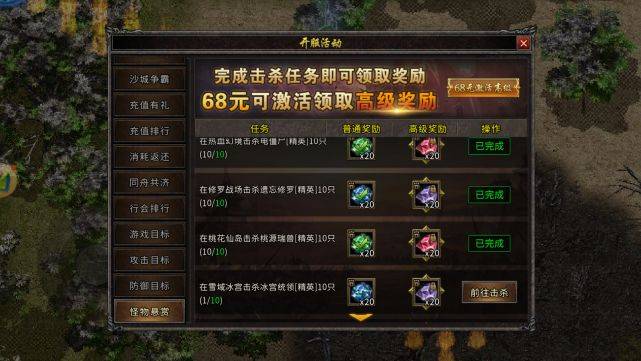 第一点就是冲开服活动了,这个怪物悬赏的话会给你一些护盾碎片和血符碎片,这些材料你可以在主城的神炉用来提升自己的护盾等级和血脉等级。