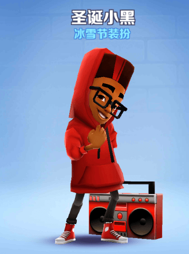 圣诞小黑是只有一套形象装扮的,叫做冰雪节装扮,这个装扮的话就是换了一身的衣服变成了卫,这个装扮的衣服颜色还是挺不错的而且音响也变成了全红的一个颜色,而且他的发型还是没有变化其他的都有就发型没有,只不过多了一跳红色的头发,是需要15个钥匙才可以解锁的一个形象,接下来我们一起去看看他的滑板外观和滑板属性吧。