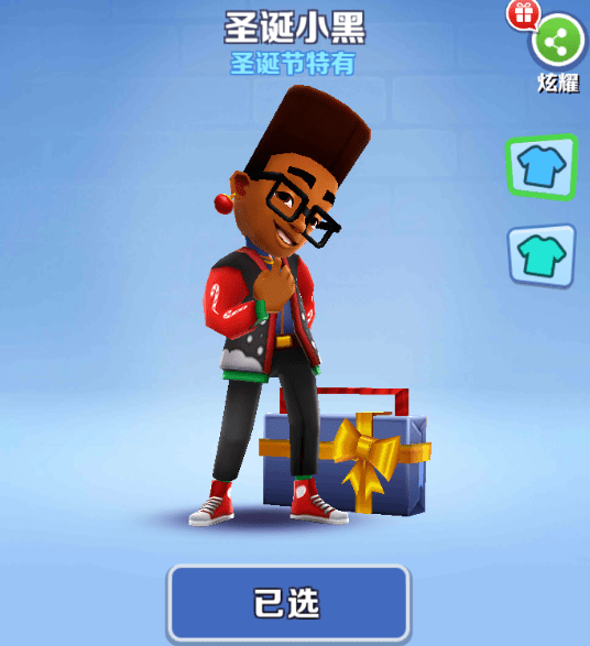 今天我们要介绍的形象有是圣诞小黑,是圣诞节特有的一个形象,这个形象是圣诞节版本的一个形象目前是暂时没办法购买的这个是比较早的一款形象了,做得也是非常不错的,人物的原型还是我们的小黑只不过现在他赛事圣诞节的装扮了,衣服和装饰那些都变了很多,连他的音响都变成了礼物包装着的了。接下来我们一起去看看装扮和滑板属性吧。