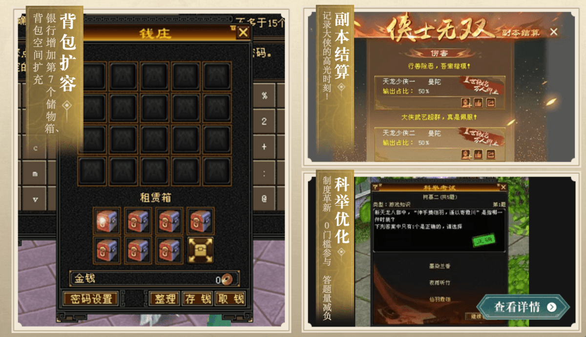 除了粗暴送礼以外,其实也看到了这次新版本的一些令人欣慰的优化点,比如背包扩容、副本结算和科举考试减负,能看得出怀旧天龙这次的更新是真的用心了,听说违规账号的处理力度也加强了,游戏生态好好搞起来,再加上这么丰厚的一大堆福利,这态度、这诚意,绝对值得冲一波了!